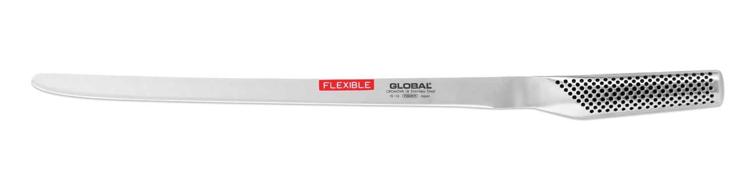 The Global G10 – 31cm Ham & Salmon Slicer is a stainless steel hand wash only slicer. It is 31 cm long, which will yield a perfect roast size for dinner.