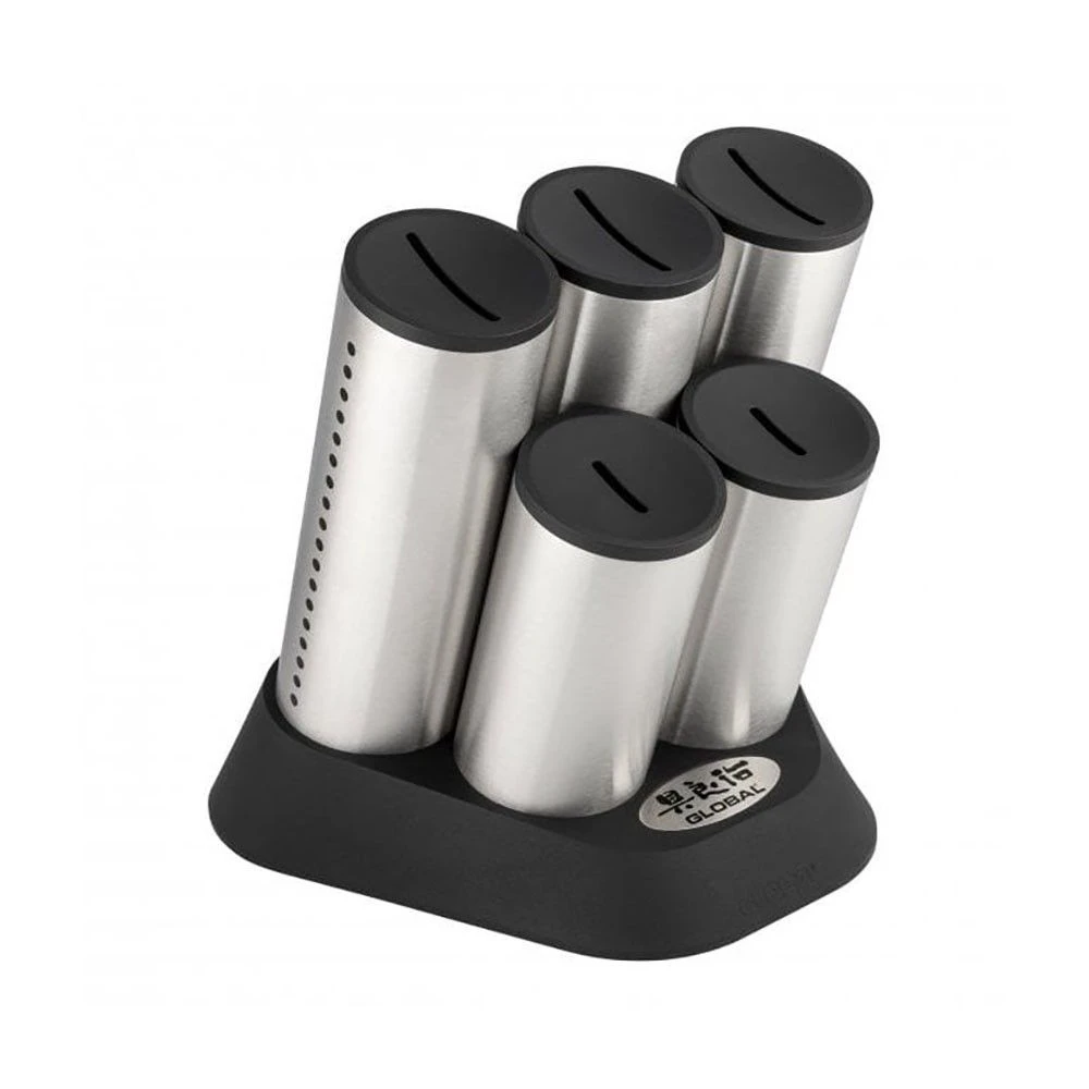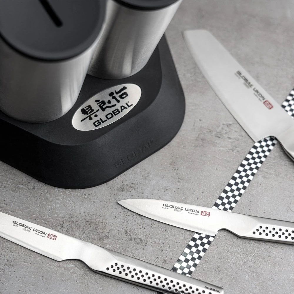 Keep your favourite cooking knives on hand at all times and in plain view whenever you need them with this beautiful Global NI Series 6 Piece Engine Knife Block Set.