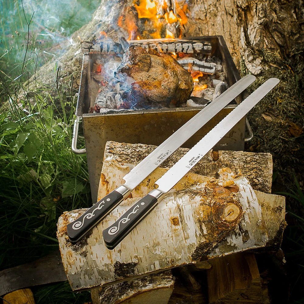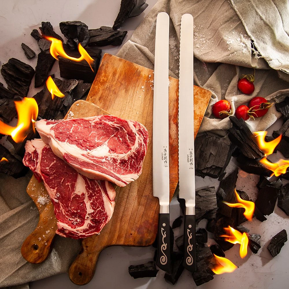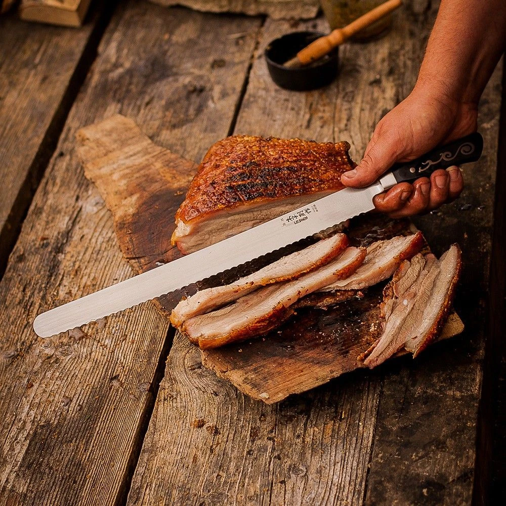 The I.O.Shen Mizu Slicer is the perfect tool for slicing meat, fish, and more! With a 14 inch serrated blade and lightweight medium handle, this slicer is comfortable to use and easy to grip with one hand. The stainless steel blade stays sharp longer and can be washed in the dishwasher.
