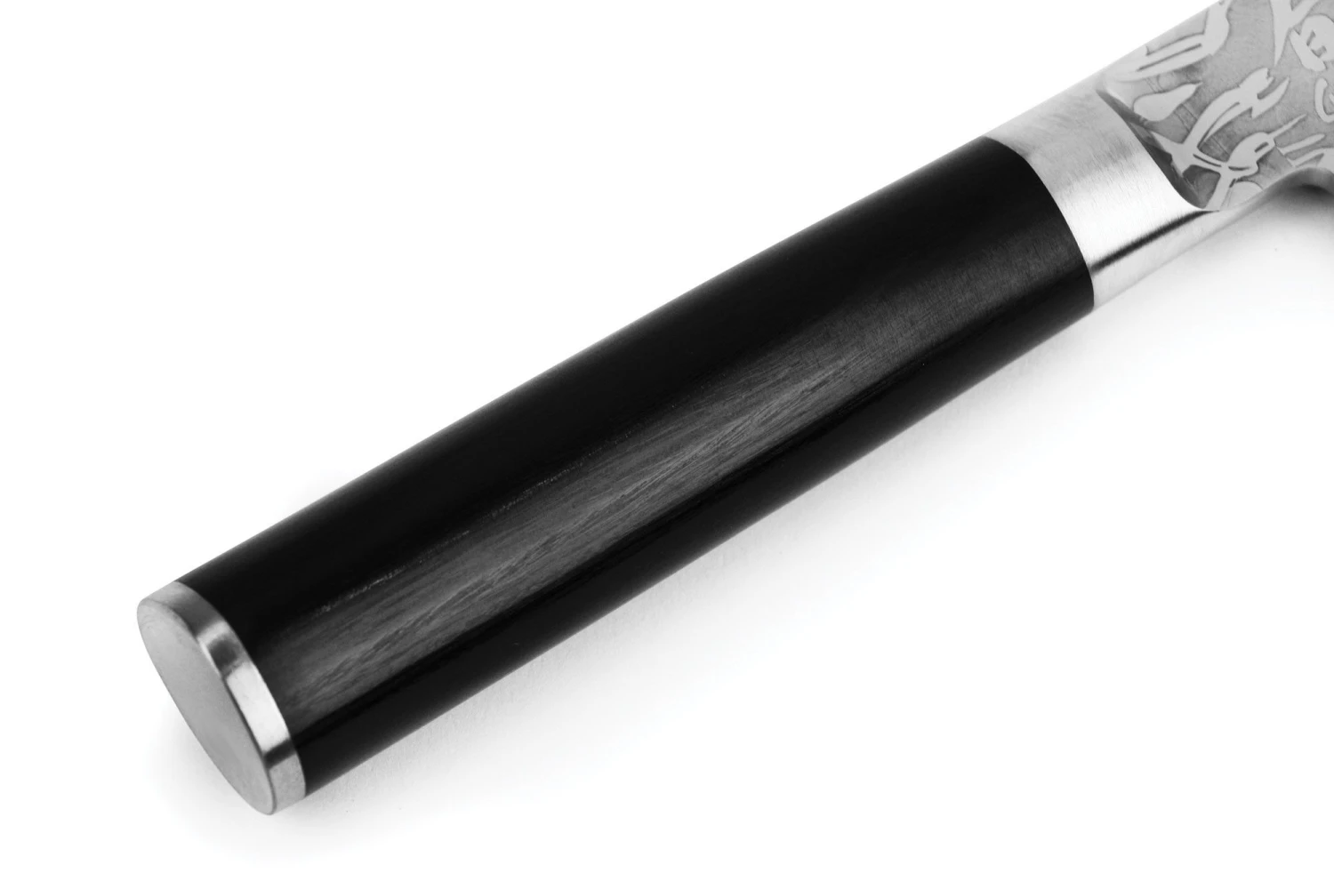 The stunning black handle is of the highest quality and has a pleasant feel while cutting. It is made of high-quality natural pakka wood treated with a special process, which makes it extremely water-resistant.