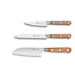 The Ideal Cuisine set is part of the Ideal collection from the signature brand Lion Sabatier®. This set is composed of a 13cm Mini-Santoku Knife, honeycomb blade for cutting, slicing raw food. A 10cm Paring Knife with a sharp tip and a rigid blade for peeling, deseeding and easily carrying out all precision tasks and a 12cm Serrated Utility Knife, serrated blade for peeling, cutting and preparing hard-skinned fruits and vegetables