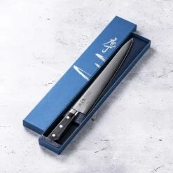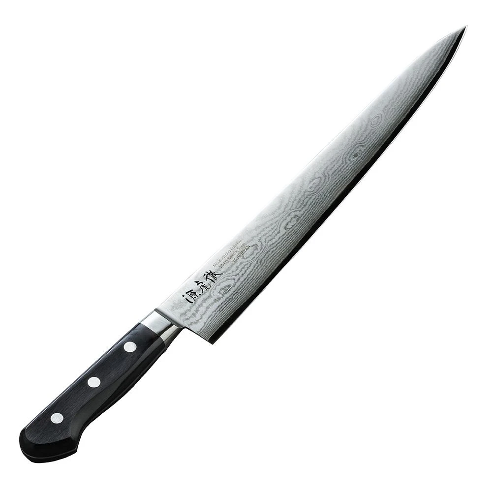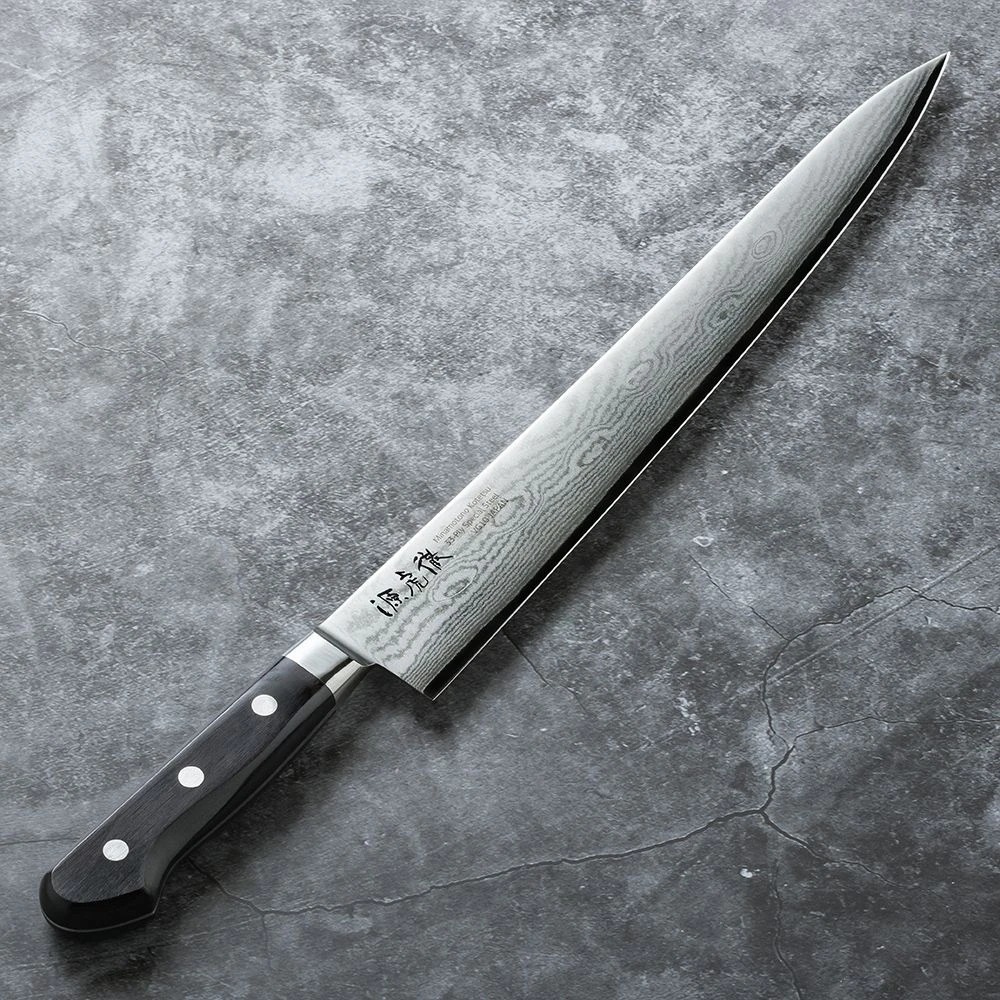 This Minamoto Kotetsu 27cm Sujihiki kitchen knife was born and raised in Seki a city of cutlery rich in nature. This range is made using 33 layers Damascus VG10 steel with unique forging process, which is making the beautiful and elegant wave of Damascus pattern.