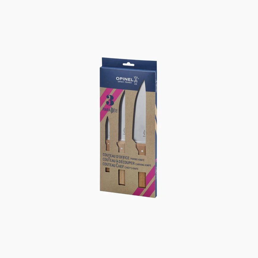 The Opinel Parallèle Trio includes a paring knife, chef’s knife and carving knife from the Parallèle range.