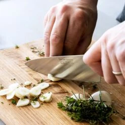 The 18cm chef’s knife features an ice-hardened, precision sharpened blade, ideal for chopping, slicing, and dicing. One of the most versatile knives in the kitchen. Fully forged from high quality German stainless steel with a hand applied 15° edge for superior sharpness, and a classically shaped DuPont™ handle.