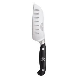 The precision sharpened Professional 12cm/4.5″ santoku knife is an all purpose knife for slicing, dicing, chopping, and mincing. It can be used for meat, fish, fruit, vegetables, and herbs. The thin, scalloped blade reduces friction and helps to prevent food from sticking to the blade, allowing you to cut things more finely and precisely.