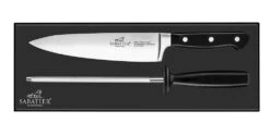 The Sabatier® Pluton 2 Piece Knife Set comes with a 20cm Chef’s Knife and 20cm Sharpening Steel. With their elegant black handle and three stainless steel rivets this 2 piece set gives you our most popular sized chefs knife alongside a sharpening steel to ensure you can keep your knife in the best possible condition. A perfect gift or treat, this set will become one of the most reached for items in your kitchen.