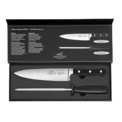 The Sabatier® Pluton 2 Piece Knife Set comes with a 20cm Chef’s Knife and 20cm Sharpening Steel. With their elegant black handle and three stainless steel rivets this 2 piece set gives you our most popular sized chefs knife alongside a sharpening steel to ensure you can keep your knife in the best possible condition. A perfect gift or treat, this set will become one of the most reached for items in your kitchen.