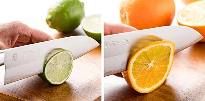 An alternative to the chef’s knife. Great for cutting, chopping and mincing vegetables. The blade has a straighter edge than a chef’s knife and has a blunted sheepsfoot-tip blade with a thinner spine. It can easily slice thin-boned and boneless meats, fish and vegetables.