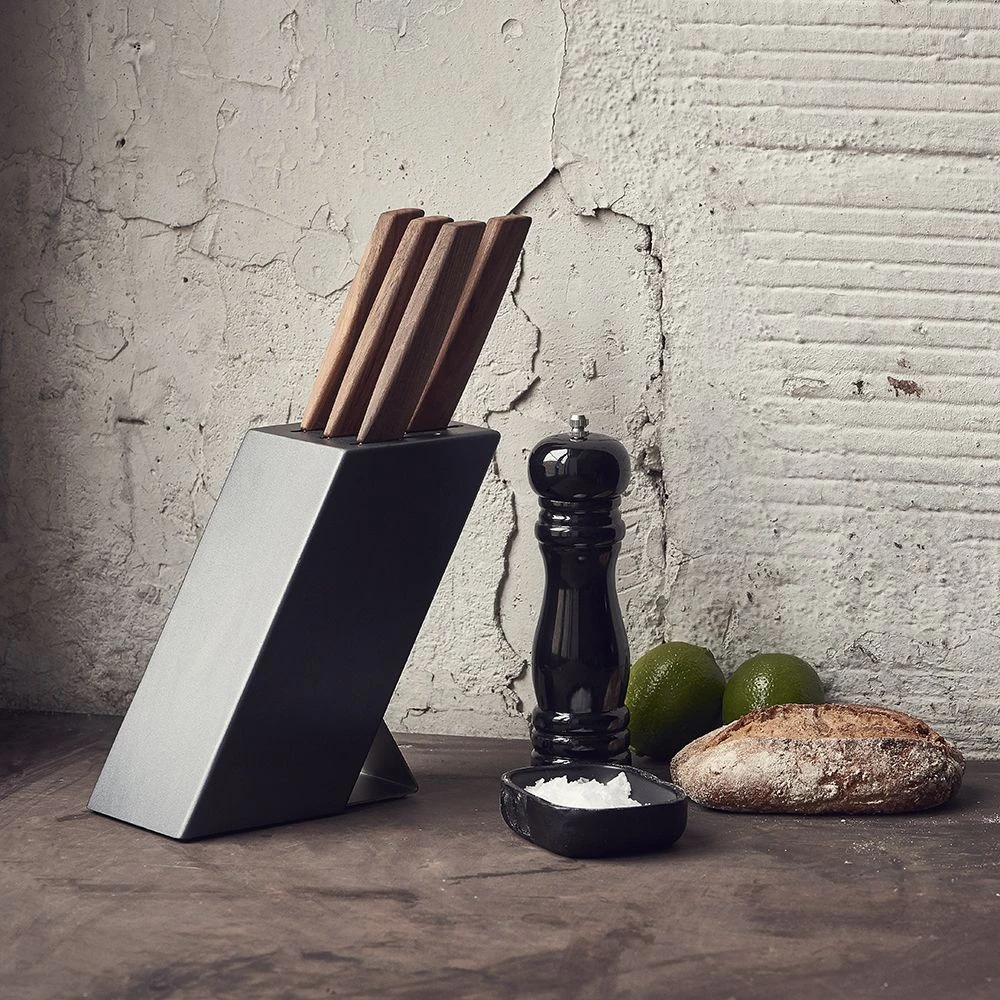 Compact Knife Block with 6 Pieces. The Swiss Modern Knife Block adds a suave, sophisticated edge to any countertop.