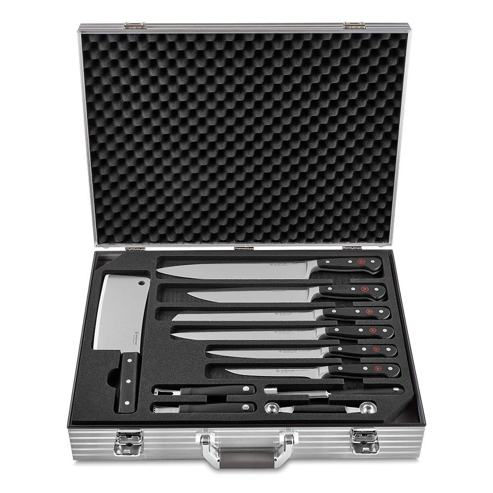 Our sturdy and lockable aluminium Chef’s Attaché Case completely filled with a selection of Wusthof knives, each item in it’s own hard foam enclosure, stacked in 2 layers, and covered with soft-foam.