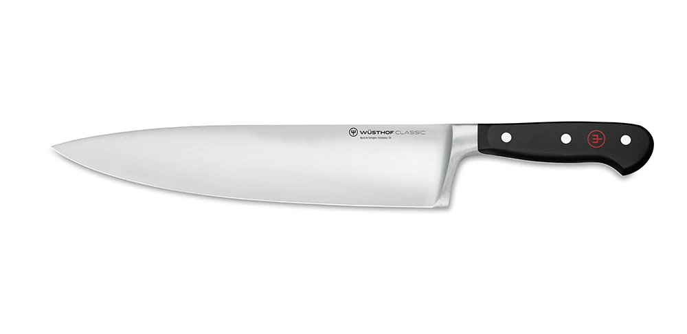 Wusthof’s best-selling collection for generations, Classic full-tang knives are precision-forged from a single piece of an exclusive high-carbon stainless steel. Classic knives feature a new handle design made of a highly durable synthetic material – Polyoxymethylene (POM); which has a tighter molecular structure to resist fading and discoloration. The Classic 36cm Heavy Cook’s Knife is the work horse of the kitchen, or the essential kitchen knife. The cook’s knife is an indispensable all-purpose kitchen knife that can be used for chopping, slicing and dicing. Due to the heavier weight and balance of this knife, it is perfect for heavy duty work such as cutting thicker vegetables and fruits such as watermelon.