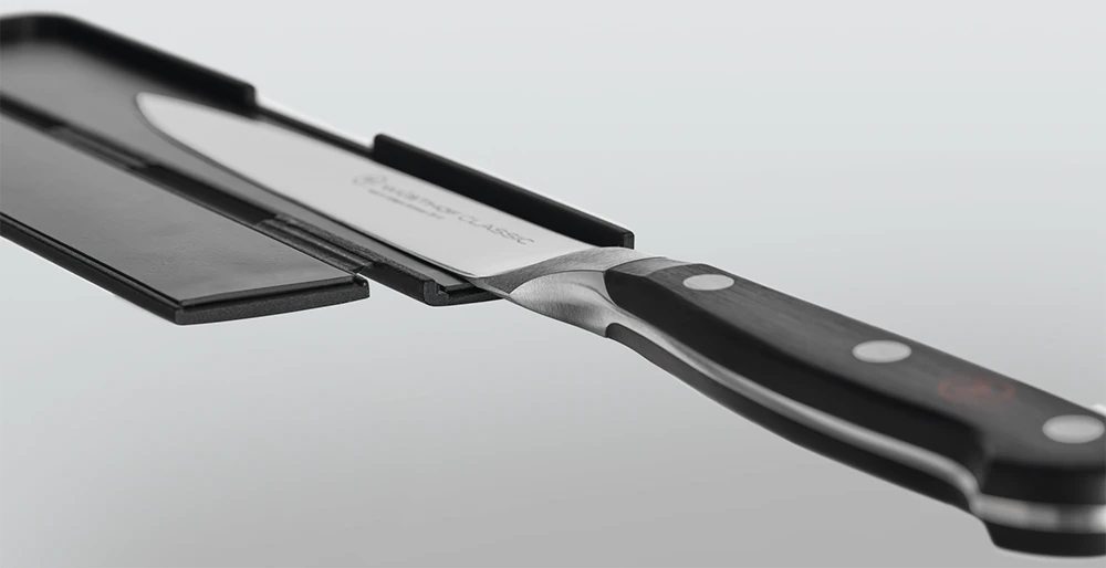 Knives dull over time, not only through use but also through inappropriate storage. The magnetic WÜSTHOF Blade Guard ensures safe storage of your knives, protecting them from scuffs and damage. This hinged blade protector is easy to open and is magnetised which allows for secure closure.